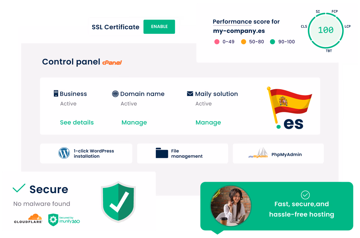 Fast, secure web hosting with Spanish tech support. European servers, free SSL certificate and instant activation.